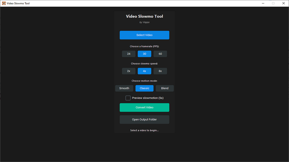 You choose a video, pick your slowmo settings, and hit Convert. The tool does the rest and saves the result in the output folder.